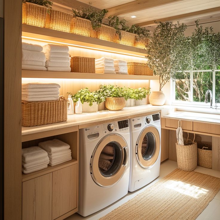 Caixas e Cestos Organizadores: Utilize cestos para separar roupas por tipo ou caixas etiquetadas para organizar produtos de limpeza. Isso ajuda a manter o espaço ordenado e evita a bagunça. • Plantas: Adicionar um toque de verde com plantas resistentes, como samambaias ou cactos, pode trazer vida ao ambiente. • Relógios e Quadros Decorativos: Relógios funcionais ou quadros com frases motivacionais podem deixar o espaço mais convidativo.
